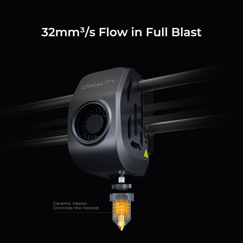 Those are just not the end of this high-speed supremacy because they are also installed with a Dual-Gear Direct Drive Extruder delivering strong extrusion force. On top of that, this extruder mingles well with its new ceramic heater, encircling the entire hot end that helps the filament to melt quickly. The hot end is heated up to 200°C within 40 seconds to achieve high-quality prints even at the level of its high printing speed. Dual fans are provided for the model cooling to avoid stringing and warping. One in the print head and an 18w auxiliary fan in the build chamber.